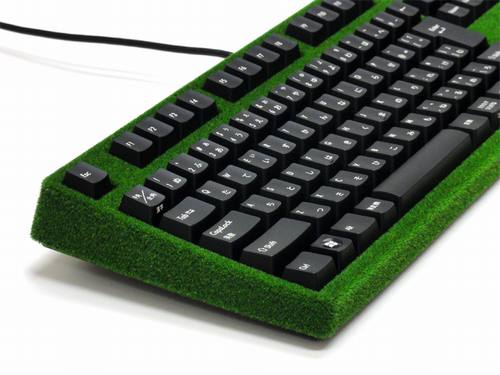「MIDORI」は静電植毛技術を採用することで、パイルを立たせた状態で キーボードの上ケース全体に植毛し、見た目、質感を芝生そっくりに仕上 げたキーボード。刈りたての芝生をイメージして、長さ2ミリのパイルを 使用した。