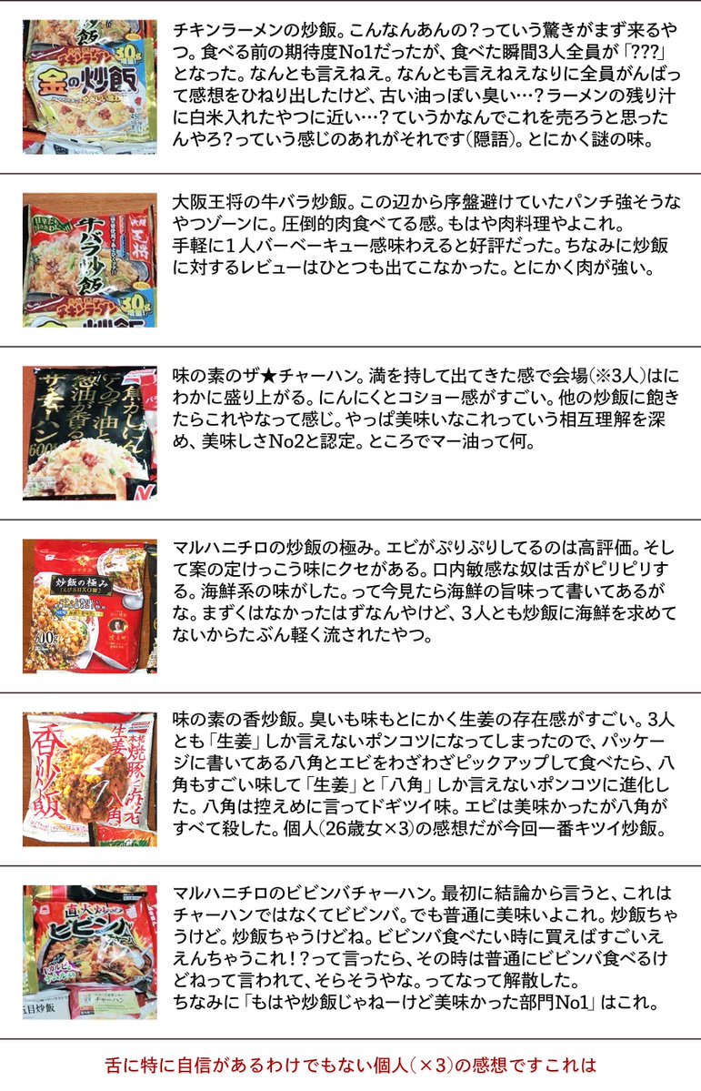 一応自分で開いた風呂敷なのでしめておきます。冷凍チャーハン食べ比べてどれが一番美味いんか調べる会の結果ですご査収ください。 pic.twitter.com/lfxm1EuL0R
